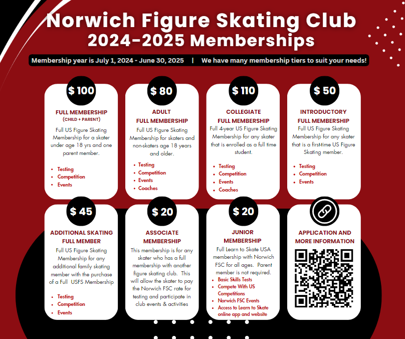Norwich Figure Skating Club offers many membership tiers to suit the needs of a beginning skater, collegiate skaters, adult skaters, and advanced skaters.